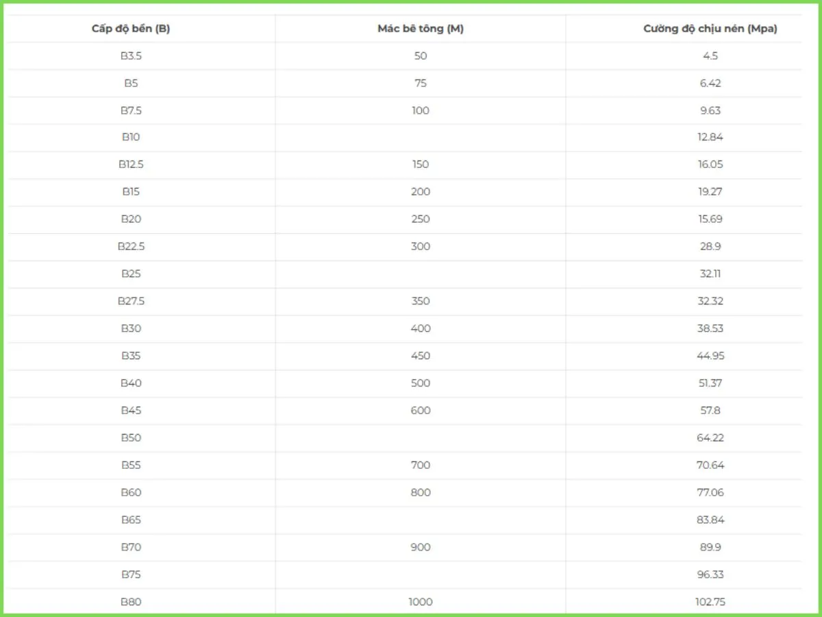 | Cấp độ bền (B) | Mác bê tông (M) | Cường độ chịu nén (MPa) | Cường độ (kg/cm²) |