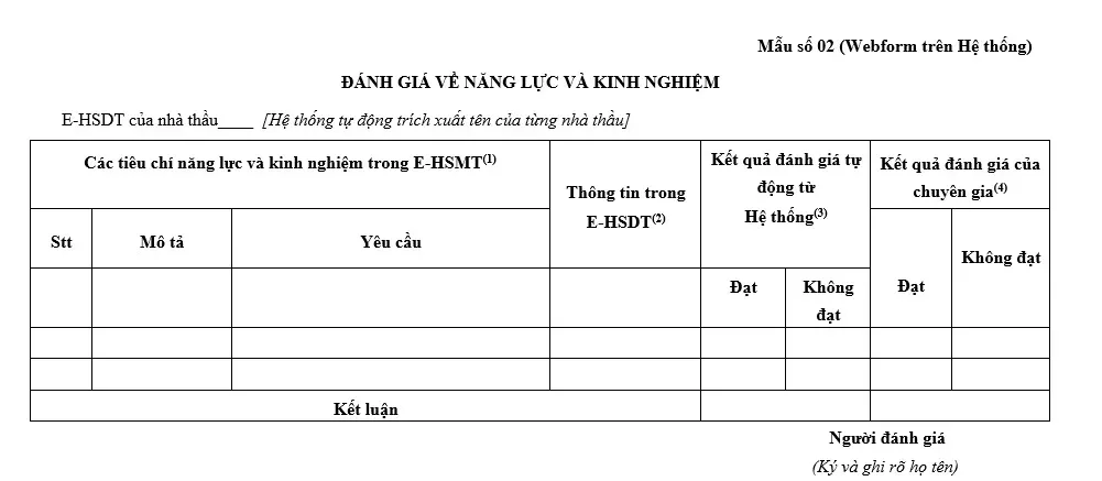 - Tải về Mẫu bảng đánh giá năng lực và kinh nghiệm (Bảng số 02).