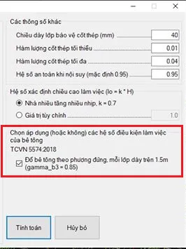 Phần mềm RCC cho phép người dùng bật/tắt hệ số γb3 thông qua checkbox “Áp dụng hệ số γb3”. Khi checkbox được chọn: