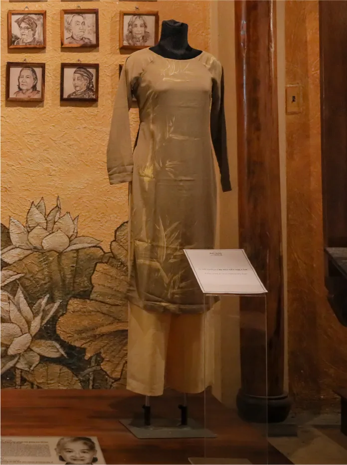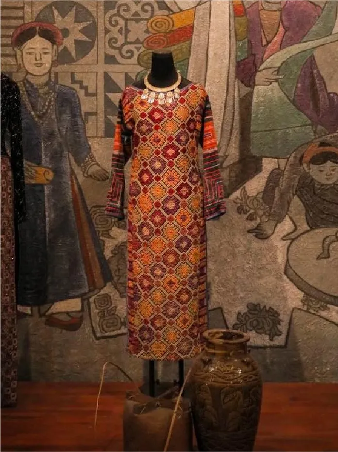 Sự kết hợp giữa phom dáng áo dài truyền thống và chất liệu thổ cẩm tạo nên chiều sâu văn hóa khác biệt.