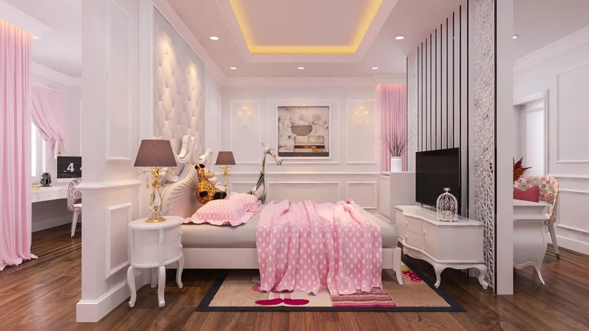 Phòng ngủ bế gái thường ưu tiên tone màu hồng pastel dịu nhẹ.