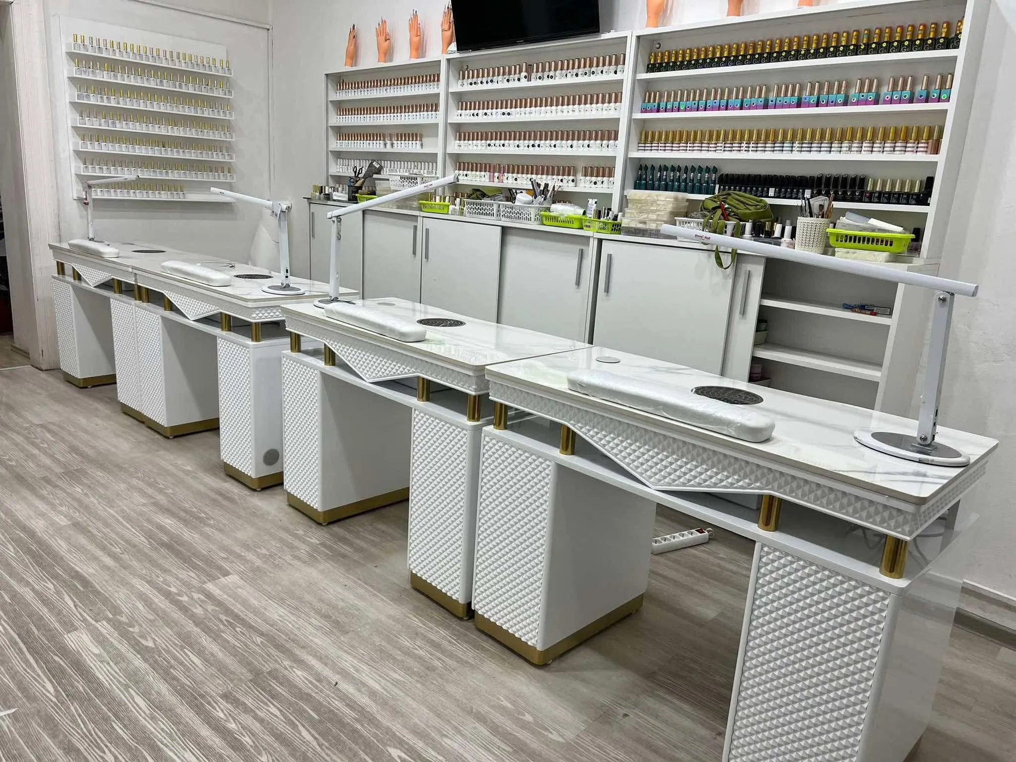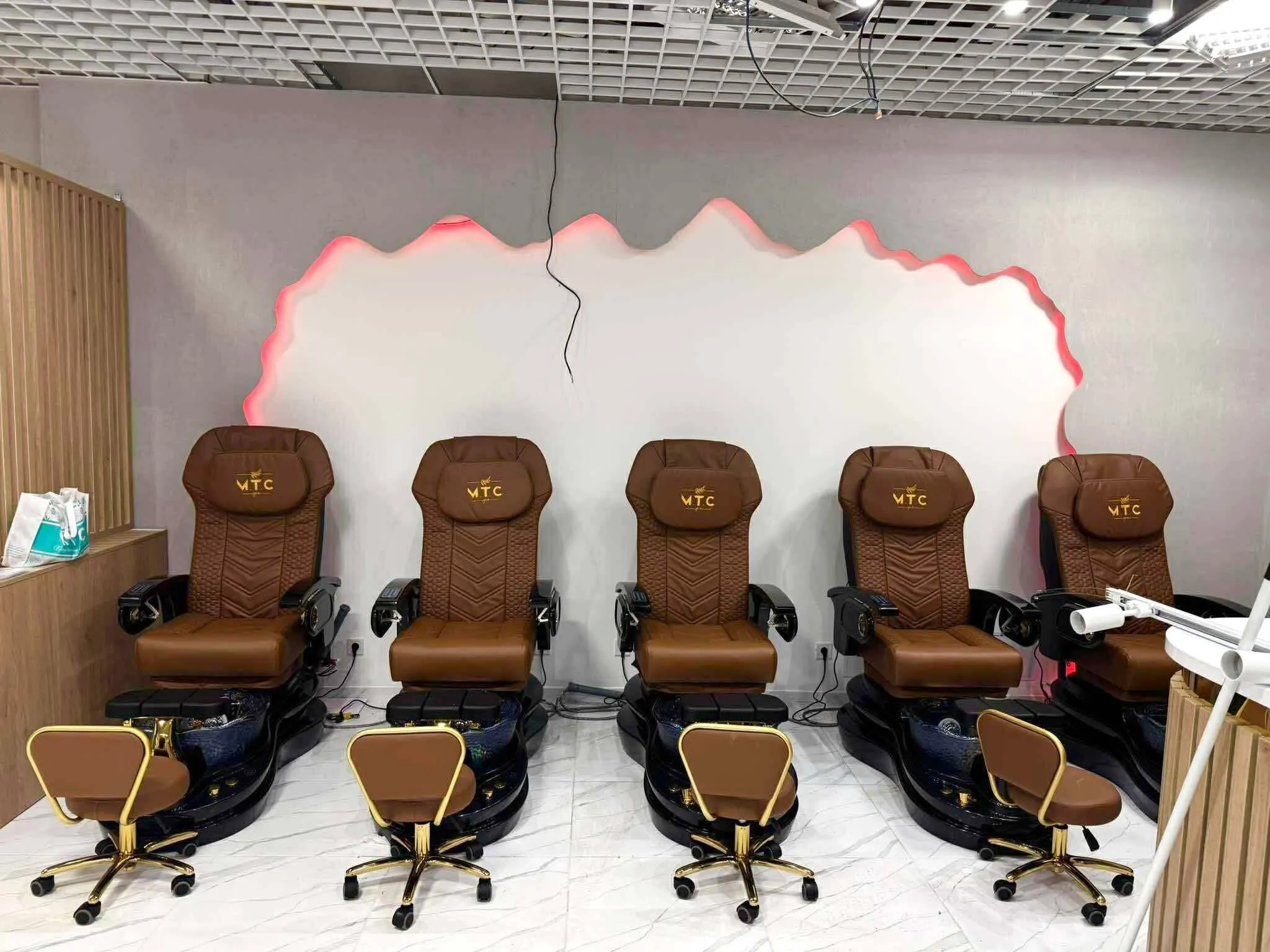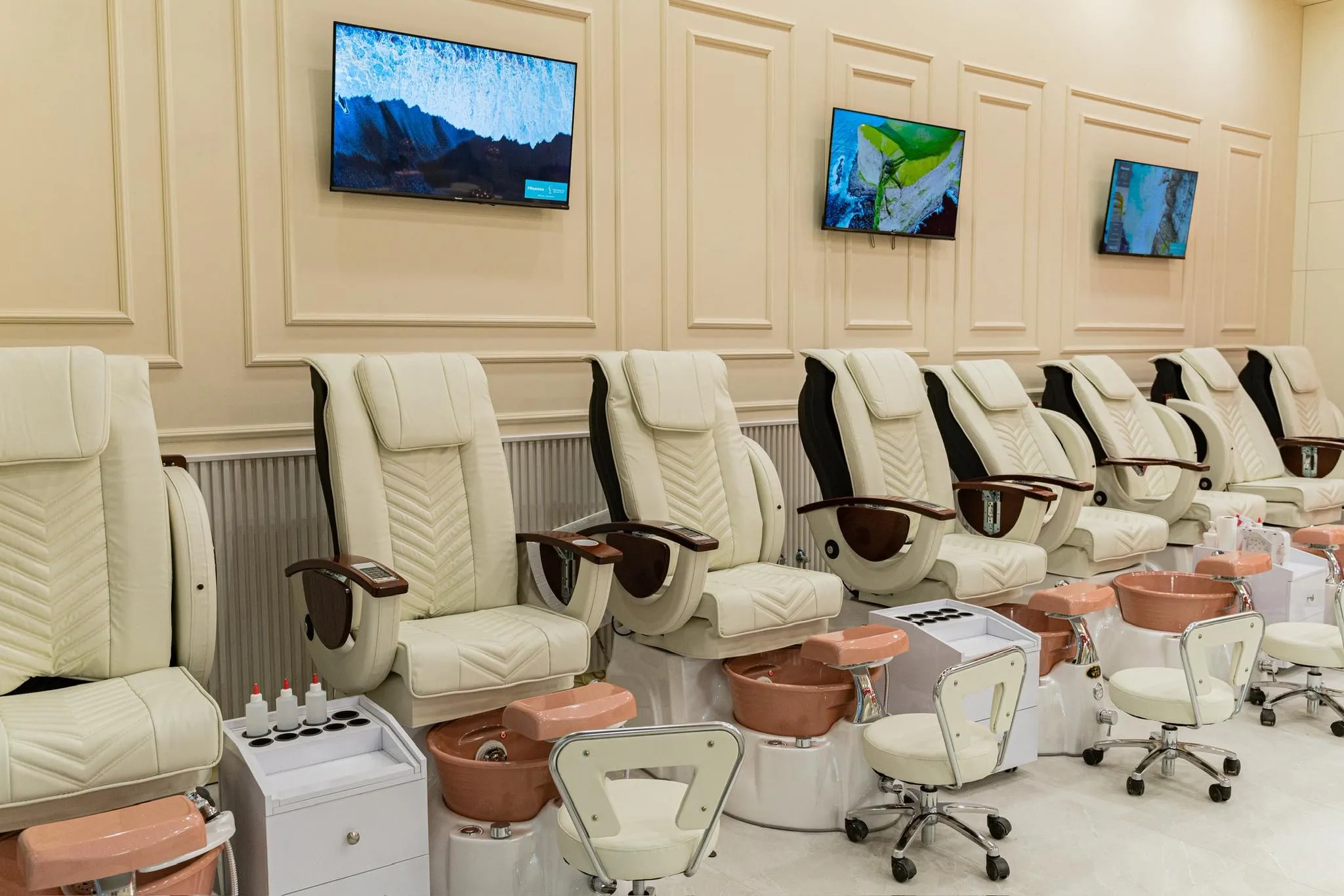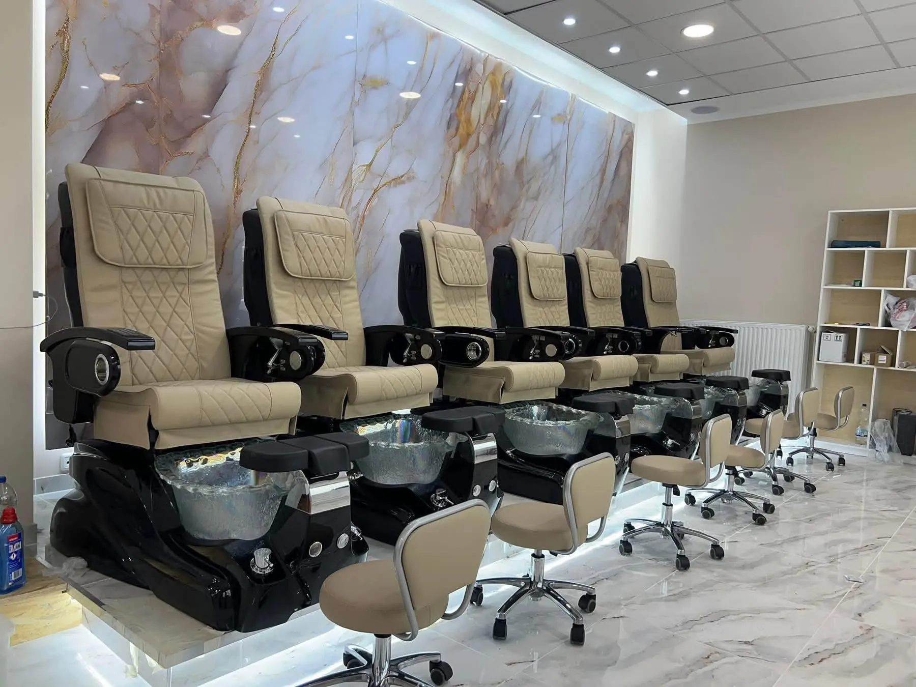 Đối với khu vực làm nail, bàn ghế phải đảm bảo tiêu chuẩn nhân trắc học. Ghế làm pedal (ngâm chân) cần được thiết kế hệ thống cấp thoát nước âm sàn để tránh rò rỉ và mất thẩm mỹ. Khoảng cách giữa các ghế tối thiểu là 1m để khách hàng cảm thấy thoải mái và kỹ thuật viên dễ dàng thao tác.